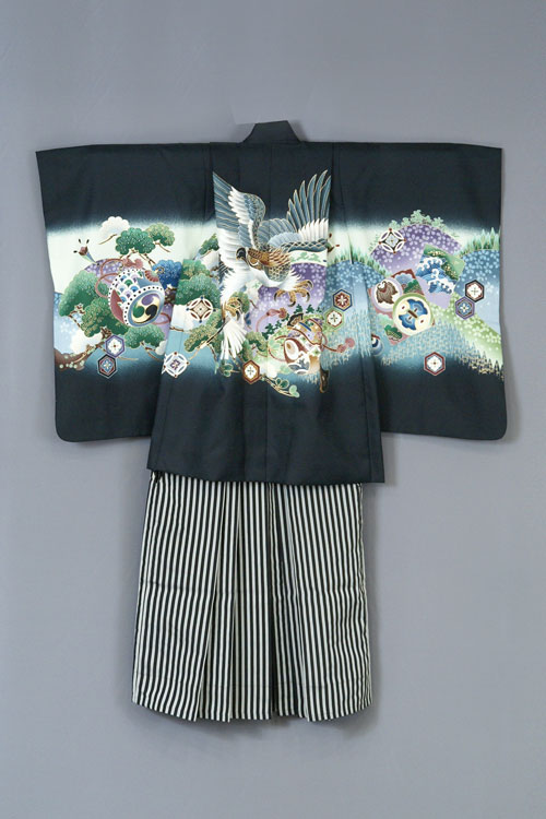 ![]() 5歳男児の七五三衣裳の一例です。 黒地に龍の柄が入った凛々しい七五三 男児用 袴です。 袴はオーソドックスな仙台平。記念写真にぴったりの衣裳です。 ¥8,800 |