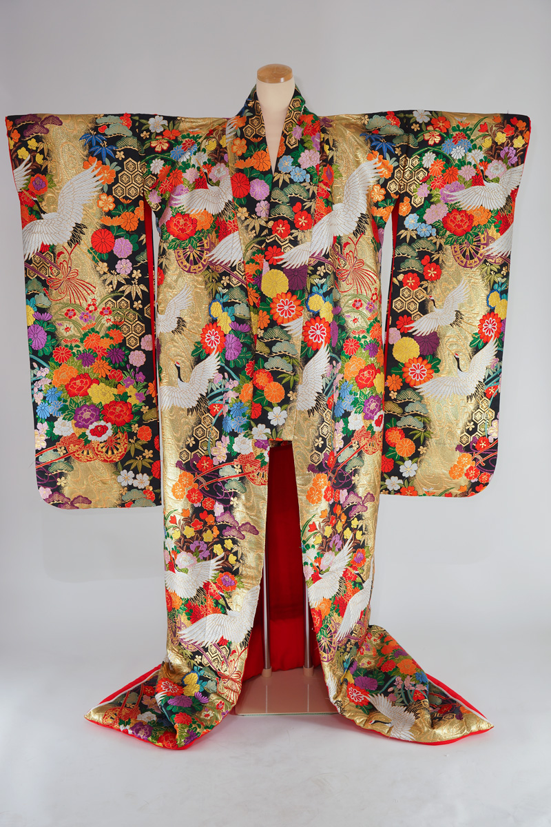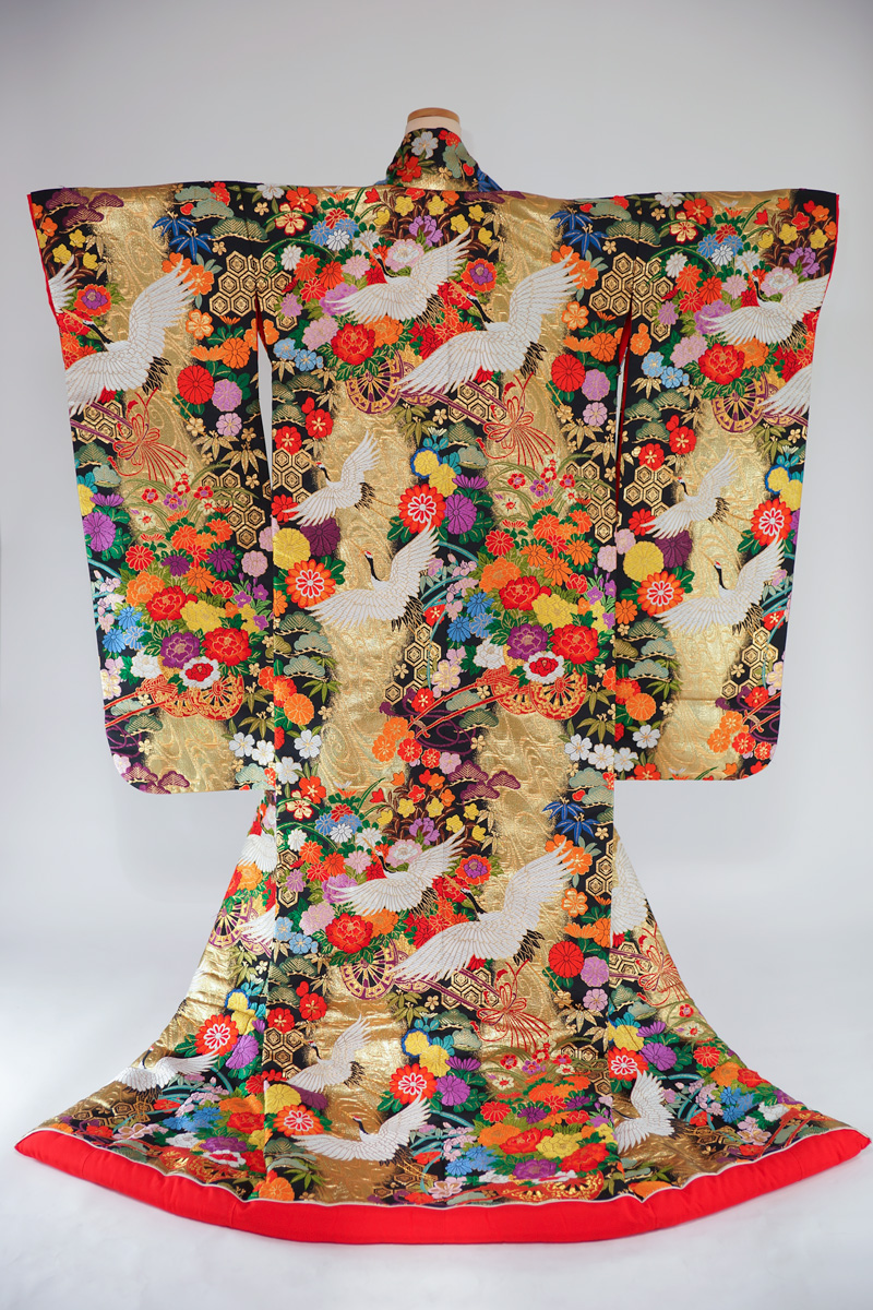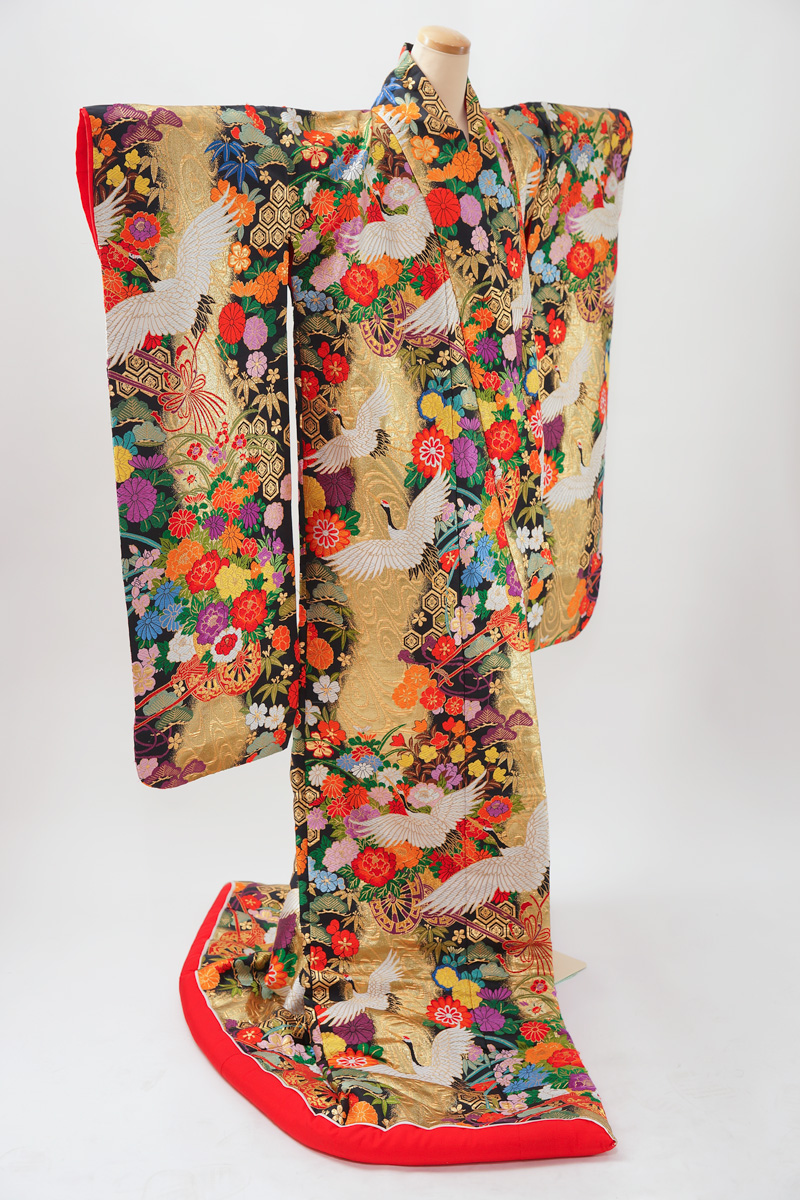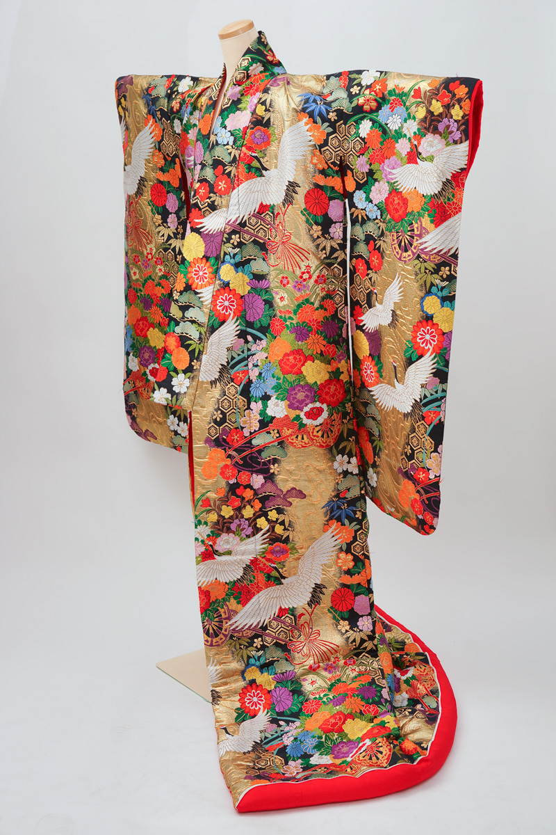 | 金色系に鶴や菊の入った鮮やかな色打掛で粋な柄。 ¥108,900 | |