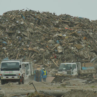 震災一か月後の名取市閖上のがれき集積場。膨大ながれきの山の前で、復旧作業が進められている。住居や店舗だったはずの建物がすべて崩れ、トラックで撤去されている。この光景は、震災の規模の大きさと、復興への道の険しさを象徴している。