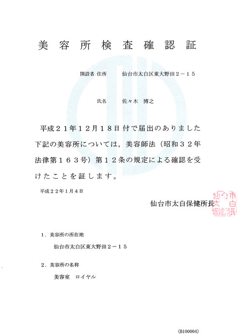 管理理容師の氏名 佐々木博之